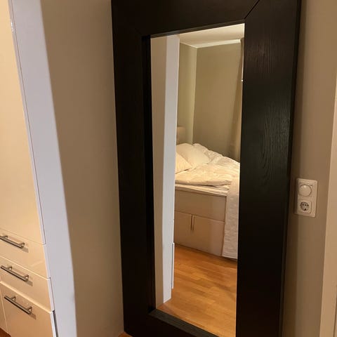 Säljer en helkroppsspegel från IKEA, modell MONGSTAD, med svart ram. Stilren och tidlös, passar bra i hall, sovrum eller garderob. Kan stå mot vägg eller monteras.