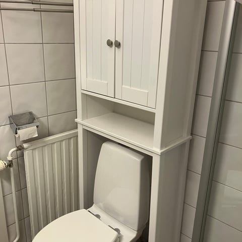 Vitt badrumsskåp med öppna hyllor och skåp.