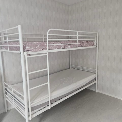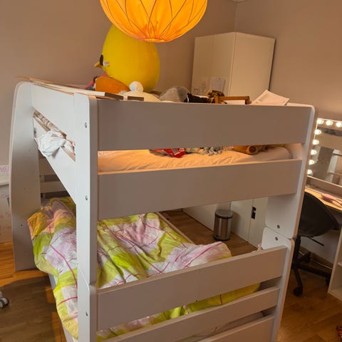 Våningssäng med stege i svart och vitt. Sängen har en robust konstruktion med metallram och är anpassad för barn. Stege för enkel åtkomst till översta sängen. Madrass ingår ej och finns att hämta i hisingen
