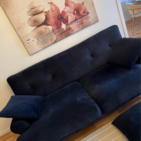 Säljer nu vår eleganta och kompletta soffgrupp i mörkblå sammet på grund av flytt. Möblerna köptes för bara ca 5 månader sedan och är i mycket fint skick.