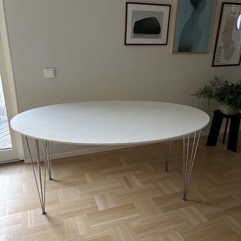 Ovalt matbord med mått 160x100cm. De svarta benen är i fint skick men själva bordsskivan har olika märken och vattenskada. Vill bli av med bordet innan januari så är öppen för bud.