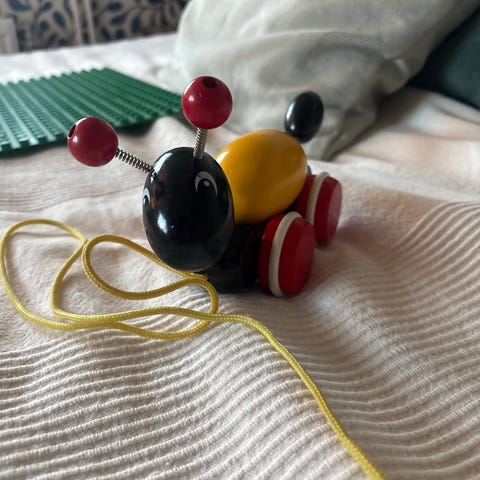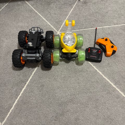 BRIO radiostyrd leksak med fjärrkontroll, inkluderar två fjärrkontroller och flera leksaksdelar i olika färger. Leksaken är avsedd för barn och har hjul för rörelse. Passar för lek inomhus och utomhus.