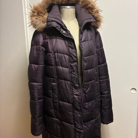 Härlig mossgrön kappa med avtagbar kapuschong och även avtagbart foder i hela kappan i storlek 40
