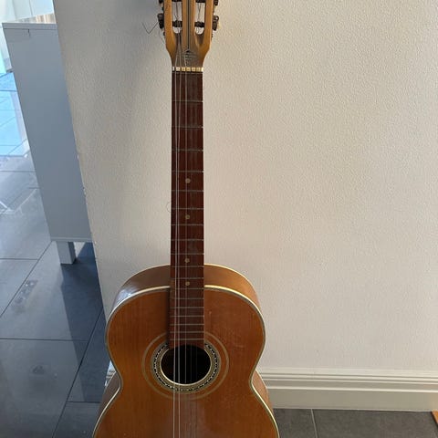 Akustisk gitarr med träkropp och sex strängar. Passar för allmän användning och olika musikstilar.