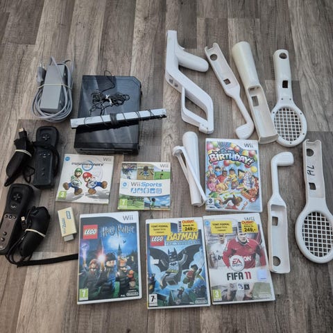 Kontroll med nunchuck och inbyggt motion plus i kontrollen. Nya batterier i kontrollen. Roliga spel så som Mario , Just dance 2, Abba, Monster High, Pet Shop, Skylanders Giants samt Skylanders Spyros adventure med portal samt några figurer. 2 figurer är hela o resten saknas ngn bit på men fungerar fint i spelet .