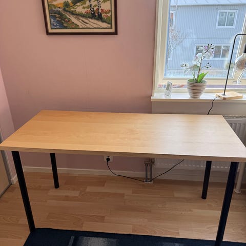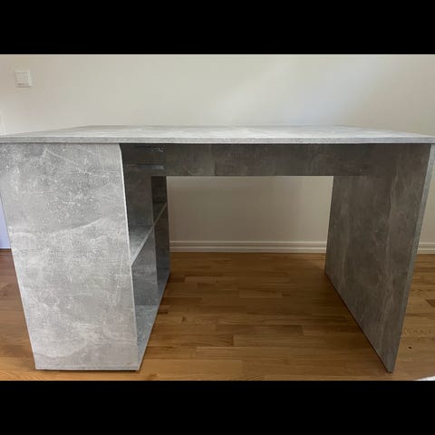 Skrivbord med betongliknande yta, utrustat med två lådor och en öppen hylla. Måtten är cirka 140 cm i bredd, 60 cm i djup och 75 cm i höjd. Passar för kontor eller hemmabruk.