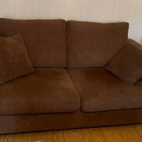 Soffa med tillhörande fåtöljer, en fotpall och soffbord bortskänkes. Den ena fåtöljen är i sämre skick med slitet tyg och missfärgning. Fåtöljerna är väldigt bekväma.