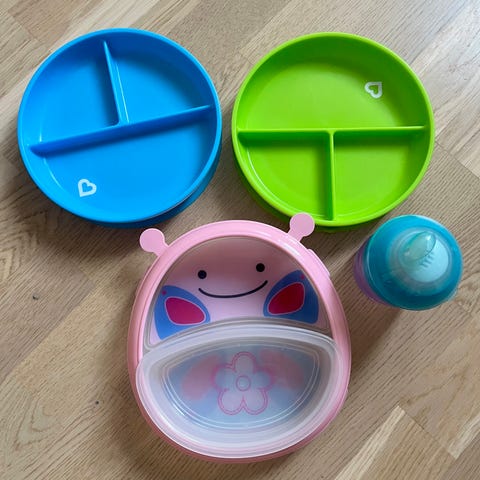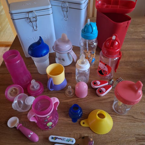 Mycket fina babyartiklar i perfekt skick som nya. Koppar med julmotiv, serveringsfat, dessertskålar, plastförkläde.