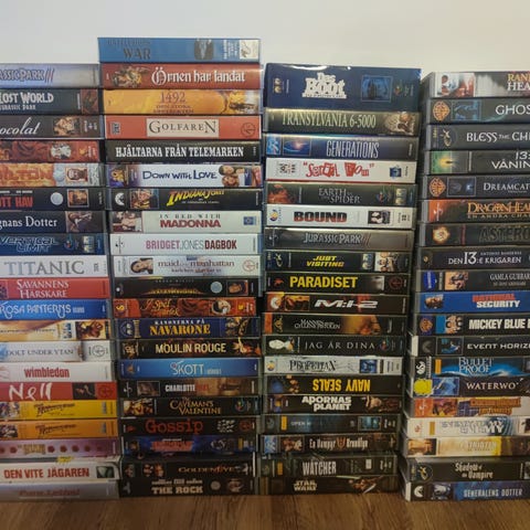 Stor samling VHS – säljs endast i paket. Blandade genrer: action, drama, thriller, komedi och familjefilm. Innehåller bl.a. Star Wars – Det mörka hotet (2 ex), Jurassic Park, Bad Boys, Beck – Hämndens pris, Carlito’s Way, Amadeus, Mitt Afrika, Flykten från Sobibor, Erin Brockovich, Den engelske patienten, Hälsore san, Evita, samt barn- och familjefilmer som Toy Story, Bambi, Pocahontas, Skönheten och Odjuret, Lady & Lufsen, Pongo och de 101 dalmatinerna, Bert m.fl. Blandat skick. Endast VHS, ej styckvis.