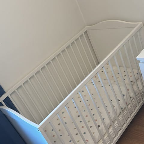 IKEA spjälsäng med inbyggda förvaringslådor under sängen. Tillverkad i trä med en grå finish. Sängen är avsedd för barn och har en madrass inkluderad. Designad för att ge en säker sovplats för spädbarn och småbarn.