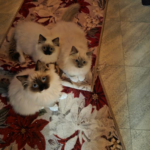 Kattungarna föddes 2025-12-07 och är leveransklara tidigast 2026-03-13 då dom är minst 12 veckor gamla. Jag tror att det är två pojkar och två flickor men ena kattungen kan avgöras mer bestämt närmaste veckorna. Två av kattungarna är mer ljust creme och är extra lugna såsom ragdoll. De andra två är mörkare creme och är lite mer pigga och energiska.