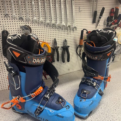 Utbytt spänne på en pjäxa, på skidbutik. Trasig rem på en innersko.
