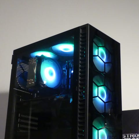 Acer Predator gamingdator med svart chassi och röda detaljer. Utrustad med flera USB-portar och ljudutgångar på baksidan. Designad för spel och högpresterande användning.
