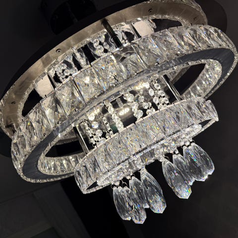 Text: Elegant taklampa med prismor. Fungerar och ger fint ljus. Hämtas.