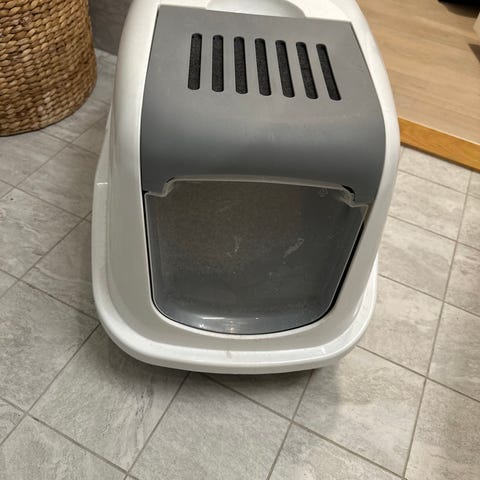 Vit kattlåda med lock och genomskinlig lucka. Lådan är av plast och har ventilationsöppningar på toppen. Passar för inomhusanvändning för katter.