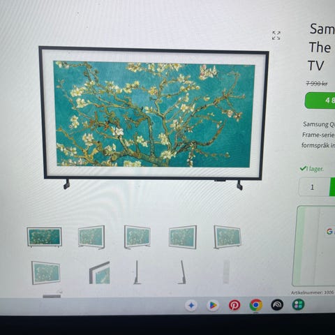 Köpte ny TV på Black Friday så säljer min Samsung The Frame 65" (QE65LS03RAU) med svart ram. Kommer med One Connect Box, The Frame väggväste, fjärrkontroll och sladdar (inga ben men denna TV skall hänga på väggen). Några smårepor men inget som påverkar tittarupplevelsen. Inga trasiga pixlar.