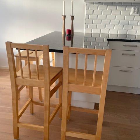Två stabila barpallar från IKEA som sågats till så de får sitthöjd 66cm. Passar till barbord i diskbänkshöjd.