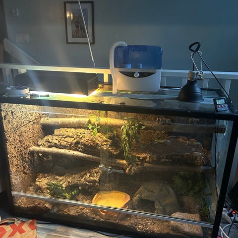 Han kommer med sitt terrarium (60x45x30)och alla nödvändiga tillbehör samt en del frysta möss som han gillar att äta.