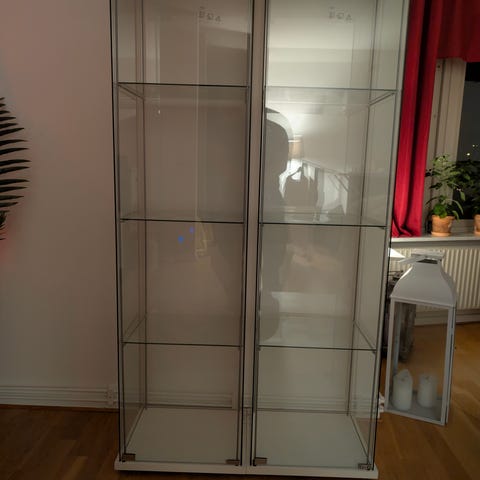 Svart vitrinskåp från Ikea med glashyllor.