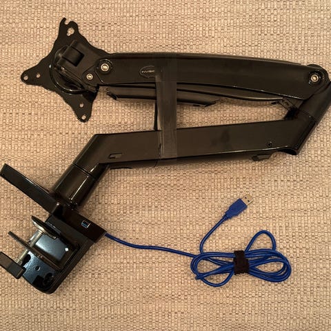 Justerbar skärmarm för montering på skrivbord med integrerade USB- och ljudportar.
