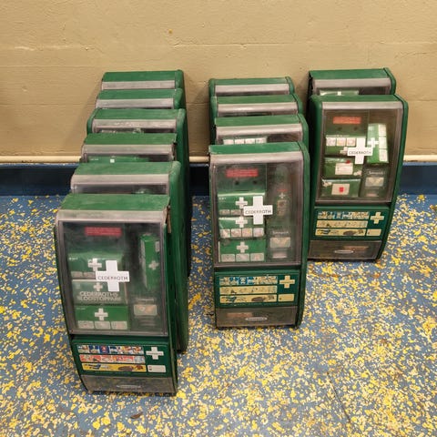 First Aid Station Första Hjälpen Station med flera förbandsmaterial och utrustning för första hjälpen. Produkten är utformad för att användas i olika miljöer där första hjälpen kan behövas.