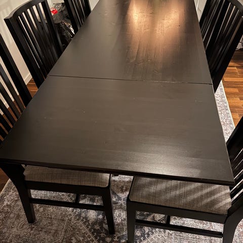 Vitt matbord, 90 cm i diameter samt fyra matstolar bortskänkes. Begagnat skick med några märken i bordskivan samt lite skav på stolsbenen. Men helt funktionellt. Finns att hämta i Skarpäng, Täby.