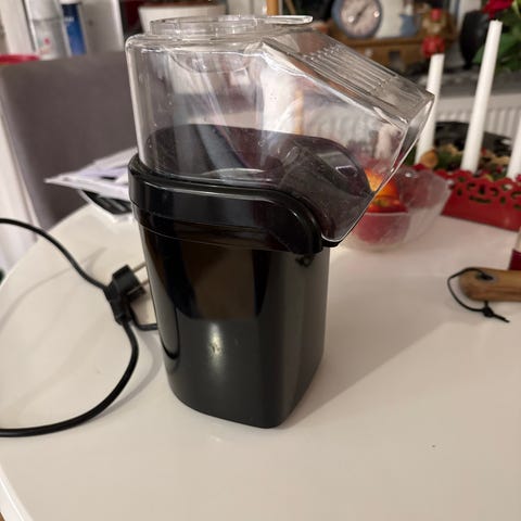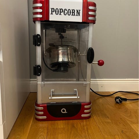 Popcornmaskinen gör ca 3 liter popcorn per batch. Kompakt och smidig, passar hemmabruk.