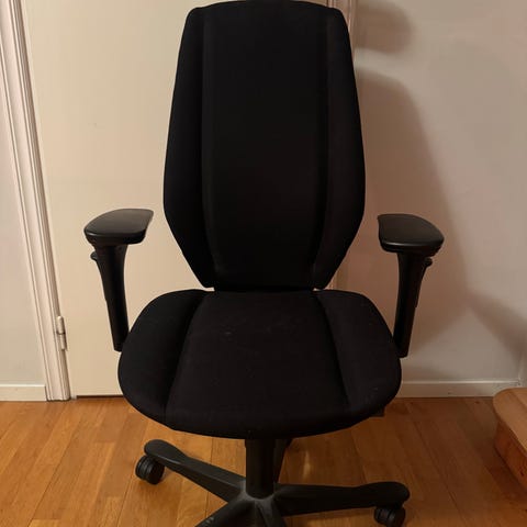 Ergonomisk kontorsstol med fotstöd, väldigt bekväm om man sitter länge, blir inte varm då det är mesh. Har varit väldigt nöjd under tiden jag haft den. Går att justera armstöden, nackstödet, ryggstödet, stöd för svanken och ytan man sitter på.