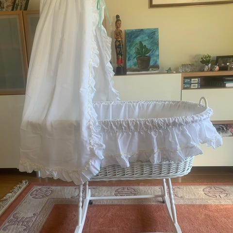 Sparsamt använd babykorg, funkar bra så länge de inte kan sätta sig upp. Kommer med tyg så man kan klä in hela korgen samt ha en säng himmel