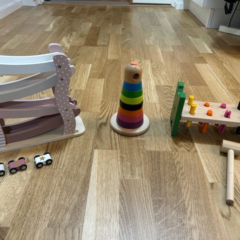 träleksak med röd och grön ramp, avsedd för barn. Tillverkad i trä och målad i flera färger. Leksaken består av en rampstruktur med en liten bil i lila färg som åker ner för rampen