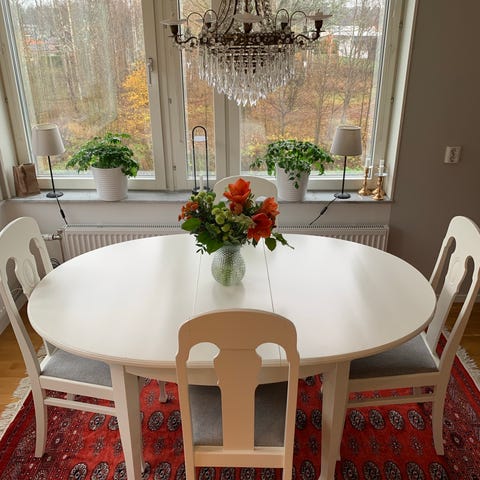 Matbord massiv björk. Längd 160. Bredd 105. Höjd 75. (210 med 50 cm iläggsskiva som ingår).