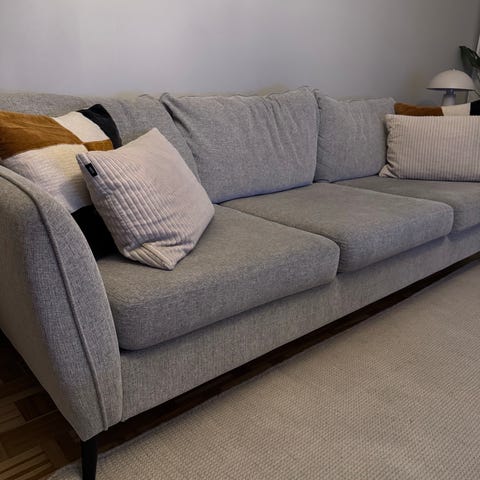 Soffan är 4-sits och fåtöljen uppskattas vara 1,5-sits. Nypris för båda är 24 990. Fäste för ena benet på soffan sprack, och sommaren 25 fick vi ett helt nytt underredet till soffan vilket gör att den är i princip i nyskick. Avtagbar klädsel på samtliga kuddar för enkel tvätt och inga fläckar finns.