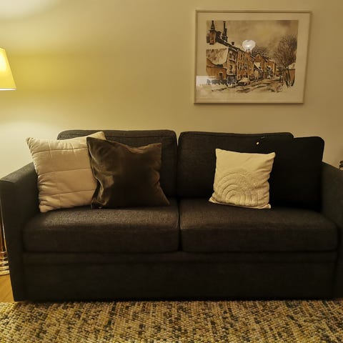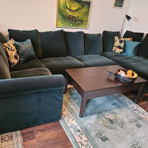 Specialtillverkad bäddsoffa i speciell grön färg med träben. Otroligt snygg soffa som också är praktisk då den blir en stor och bekväm säng.