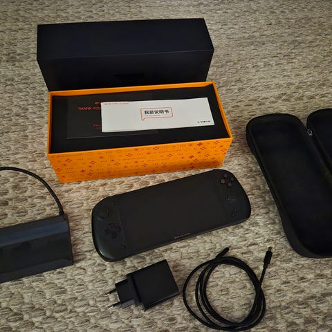 Steam deck LCD handhållen spelkonsol med inbyggd skärm och kontrollknappar. Konsolen levereras med laddare och förvaringsväska. Passar för spel på språng och erbjuder en portabel spelupplevelse.