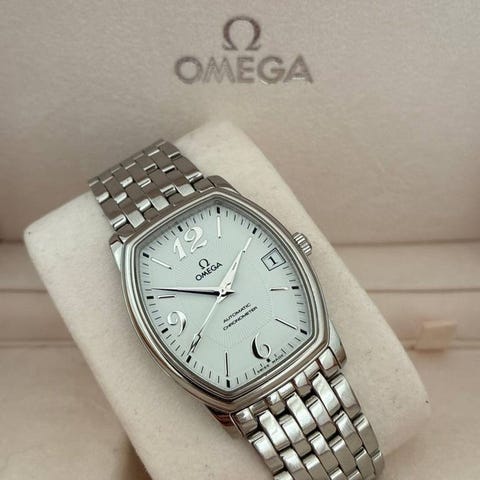 De Ville Hour Vision Co-Axial 41nn med svart läderband. Klockan har en blå urtavla med datumvisning och en boett i rostfritt stål. Den är designad för män och kombinerar klassisk stil med funktionalitet.