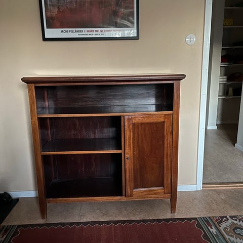 Funkis bokhylla från 1930/40-tal i betsad björk/alm med 3 lådor i fint bruksskick se bilder. Finns skador på ovansidan som går att slipa bort för den som orkar.
