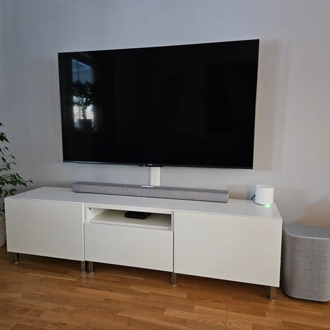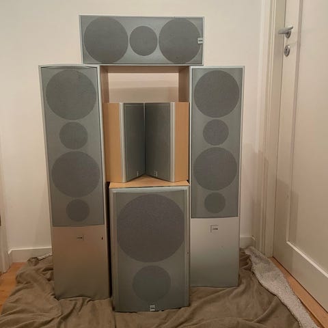 Harman Kardon hemmabiosystem med högtalarsystem. Systemet inkluderar en förstärkare och flera högtalare,