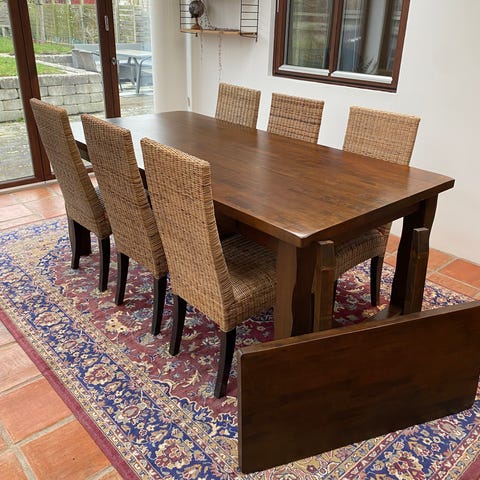 Matbord i ek med med tillhörande iläggs-skiva och sex matchande stolar. Bord 150x100 + iläggs-skiva 50 cm