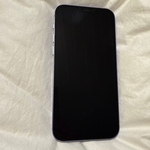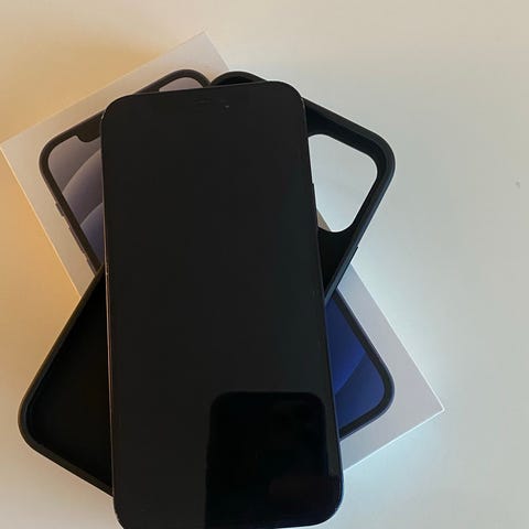 Apple iPhone 12 med 128 GB lagringskapacitet i svart färg. Mobilen har en batterikapacitet på 86 % och kommer med ett svart fodral med kortfack och magnetstängning.Telefonen är utrustad med en dubbelkamerasystem på baksidan.