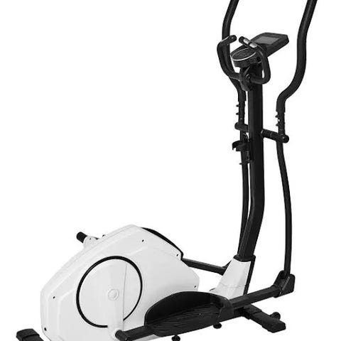Elliptisk träningsmaskin i vit färg. Utrustad med digital display för att visa träningsdata. Passar för konditionsträning och kan användas i hemmiljö.
