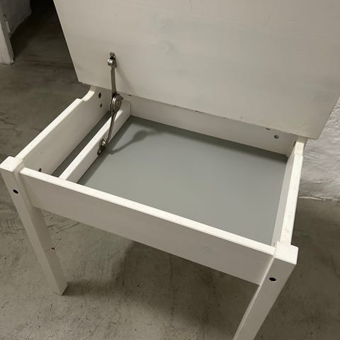 Skrivbord köpt med största sannolikhet på Jollyroom för ett antal år sedan. Välanvänd, med tusch och bucklor/svällt av vatten. Detta är synligt på bordsskivan (se foto 5,6,7). En låda. Skav på ben (se foto 9). Stommen är av ek. Lite ranglig.