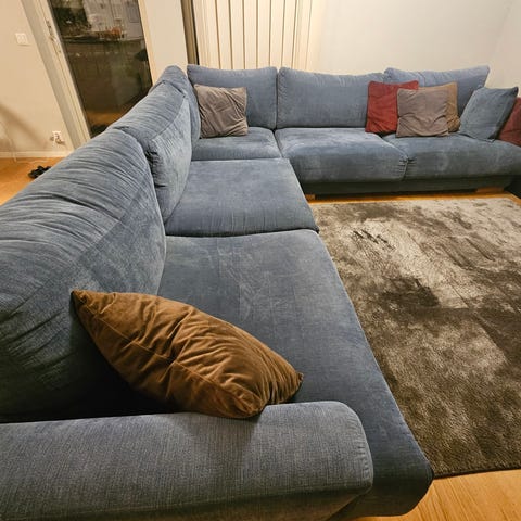 Beige hörnsoffa med schäslong, inklusive flera matchande kuddar. Soffan har en ljus beige klädsel i manchester. Medföljer 4 kuddar. Säljs pga flytt.