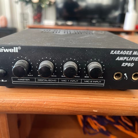 Colorful Karaoke Sound System med två trådlösa mikrofoner. Systemet är designat för karaokeanvändning och levereras i en förpackning som innehåller högtalare och mikrofoner.