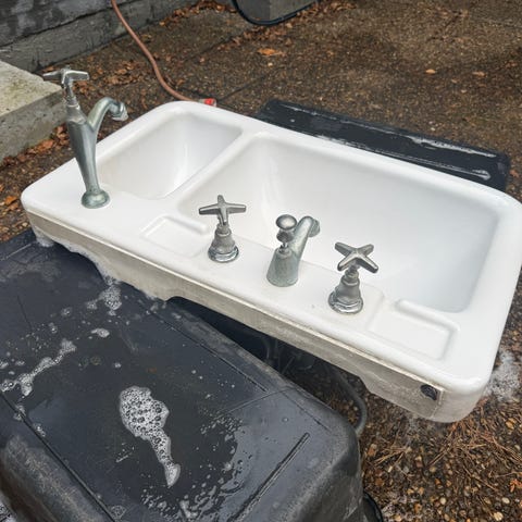 Fyra äldre handfat i porslin med olika kranar och avlopp. Handfatet på bild 1 har en liten spricka.