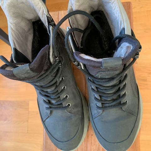 ECCO vinterskor i storlek 39, tillverkade i svart läder. Skorna har snörning och dragkedja för enkel på- och avtagning. Fodrade med varm pälsinsida för isolering mot kyla. Grovmönstrad sula för bättre grepp i vinterförhållanden.