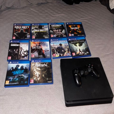 Playstation 4 med två handkontroller och 3 spel. Funkar felfritt (både kontroller och själva konsolen).