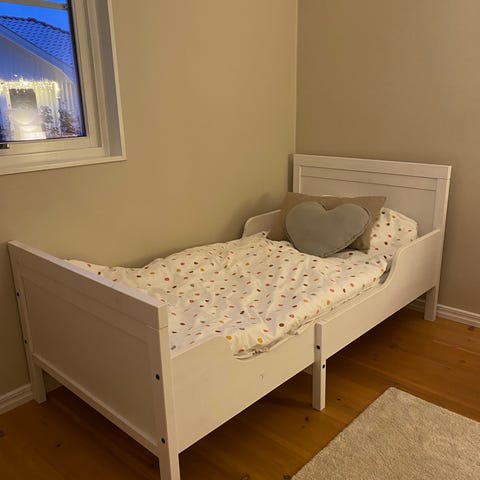 Utdragbar säng med ribbotten,som kan förlängas i takt med att barnet växer.