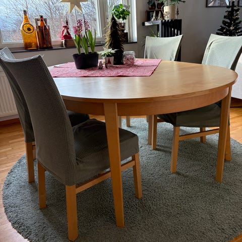 Matbord inklusive 6 stolar i bra skick (något litet litet märke på bordet från lim som säkert kan tas bort) det stör inte helheten.