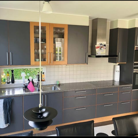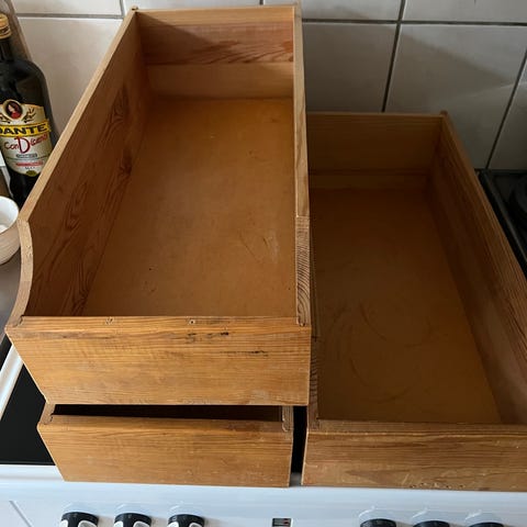Massiva furuluckor/lådfronter. Finns även 5 st lådor omålade samt 2 st luckor till högskåp, dock inga stommar till dem.