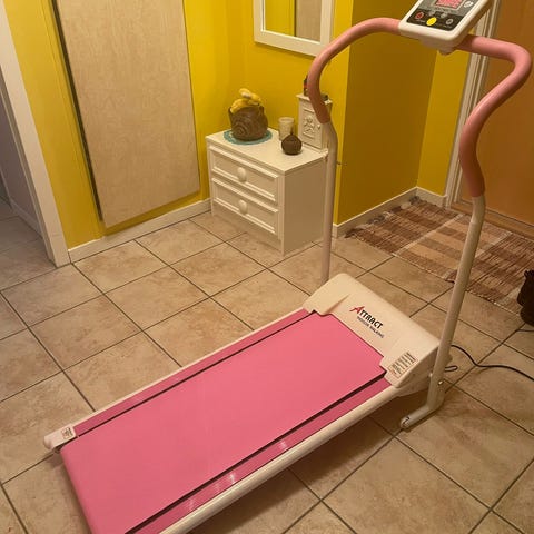 Löpband i svart färg. Utrustad med handtag och kontrollpanel för inställningar. Används för inomhusträning och promenader.
